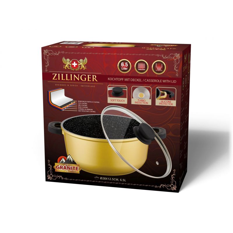 Cratita din aluminiu cu interior de granit si cu capac din sticla termorezistenta, cu o capacitate de aprox. 6.5 litri, este ideala datorita stratului non-aderent de granit ce nu permite lipirea preparatelor. Alimentele se pot gati mai usor si mai rapid cu aceasta cratita de calitate superioara de la Zillinger.