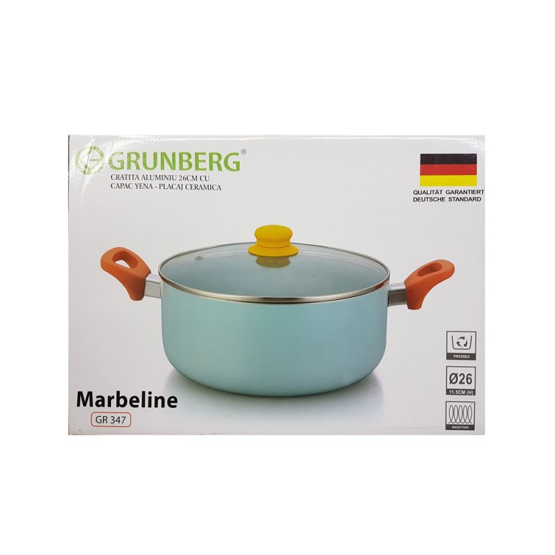 Cratita tip Tuci din Aluminiu de la Grunberg cu diagonala de 26 cm si o capacitate de aprox. 4.5 Litri, cu capac confectionat din sticla termorezistenta si placaj interior din ceramica marmorata de inalta calitate, fara chimicale toxice. Cratita este colorata, fiind disponibila in diferite culori in functie de stoc.