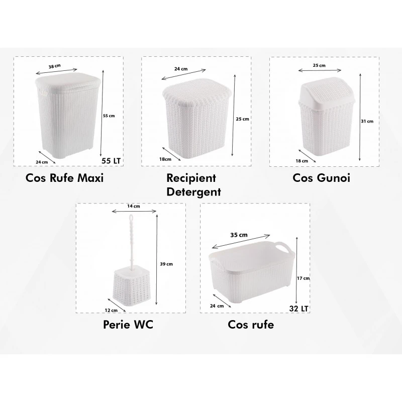 Setul pentru baie este din plastic, design dantelat, are 5 piese: