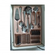 Set de tacamuri pentru 12 persoane, format din 84 de piese, in cutie din material metalic ce imita lemn cires, contine ustensilele necesare servirii mesei.